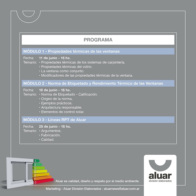 Aluar invita a su ciclo de charlas online: “Ventanas Eficientes” en el que se abordará de forma integral la eficiencia energética de las ventanas, los factores que definen su rendimiento térmico, y las variables que lo modifican, entendiendo a la ventana como jugador fundamental en la eficiencia energética del edificio y en la contribución hacia una Arquitectura responsable.
