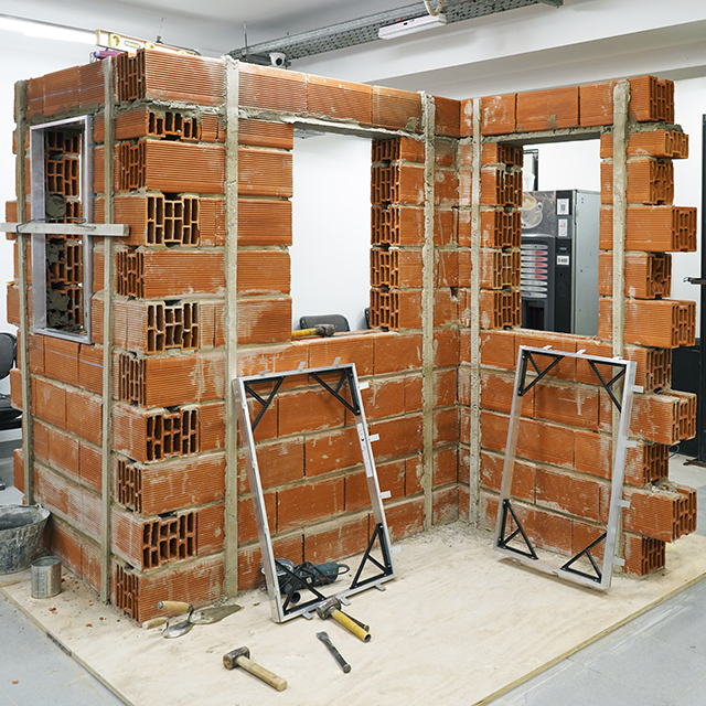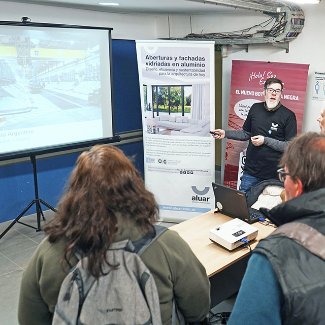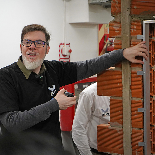 Durante la jornada, cada empresa integrante del Grupo dictó instancias de formación técnica con materiales reales de obra. En nuestro caso, el Ing. Leonardo Spinelli, Coordinador de Asistencia Técnica, junto a Andrés Pereyra, estuvieron a cargo del módulo práctico “Premarcos: una pieza clave en la correcta colocación de aberturas en obra”.