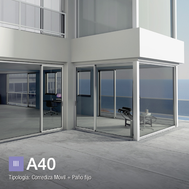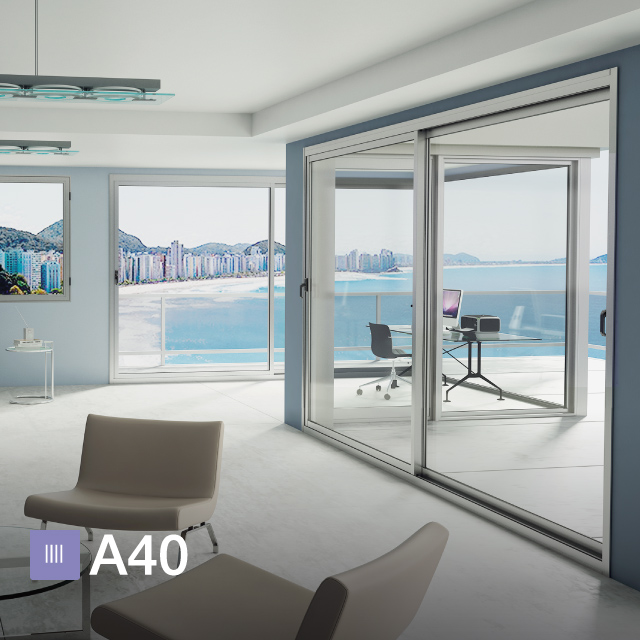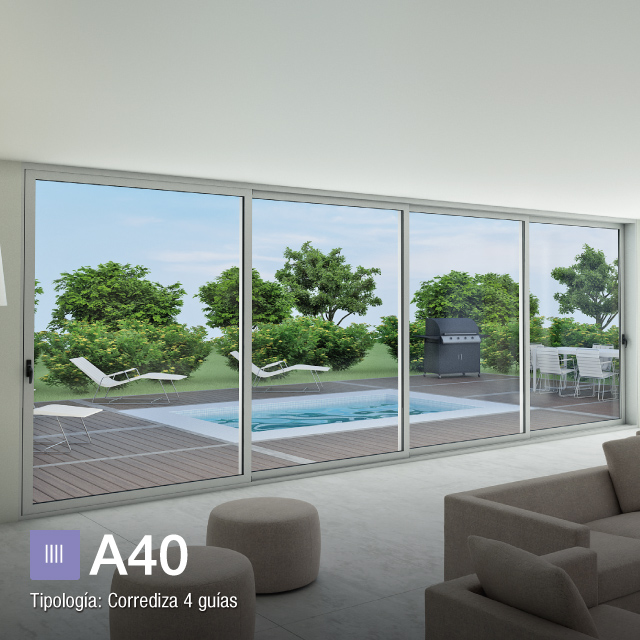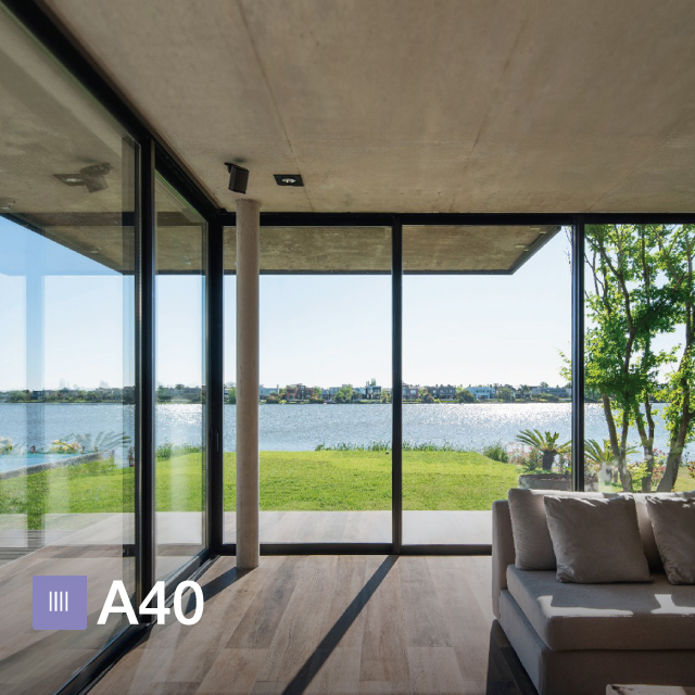 A30 new brinda la posibilidad de realizar corredizas de 2 y 3 guías con varias combinaciones de hojas y ha sido utilizado en múltiples proyectos. Sin embargo, la línea A40 brinda un abanico de posibilidades para corredizas aún más amplio, lo que permite resolver las aberturas de todo el proyecto: corredizas de 2,3, y hasta 4 guías. Esta última opción, permite obtener una amplia apertura de las hojas para maximizar la conexión del espacio interior con el exterior y es ideal para su utilización en salones de usos múltiples (SUM), locales comerciales, livings, expansiones y quinchos. Además, la lograda tipología fijo móvil que permite combinar corredizas con paños fijos, obteniendo así mayores superficies vidriadas, privilegiando las vistas al exterior.